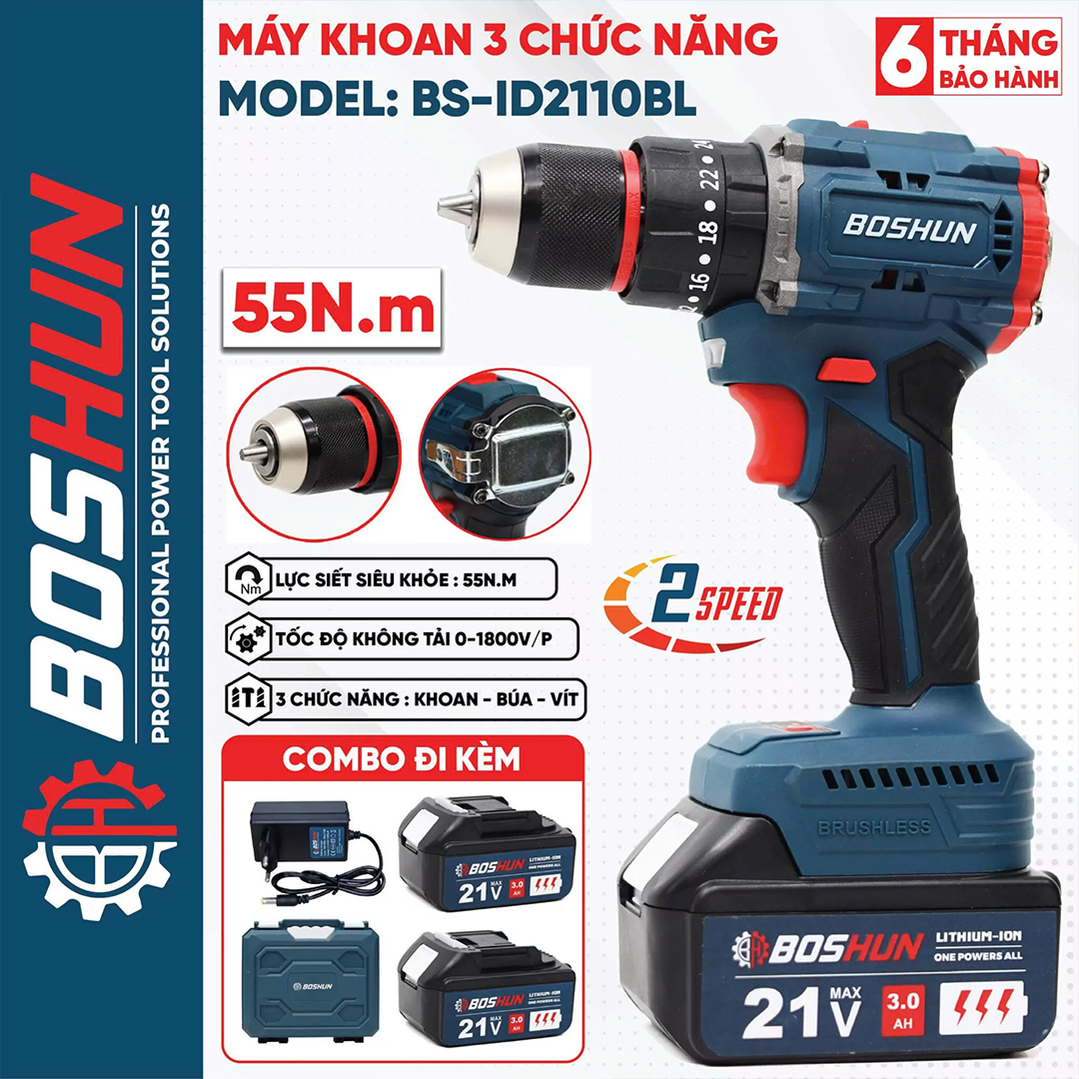 Máy khoan pin Boshun BS-ID2110BL (55N.m) - Đầu kẹp Autolock 10mm