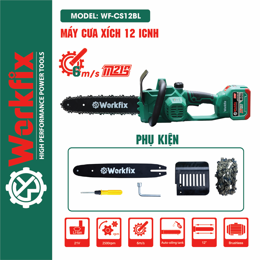 Máy cưa xích pin Workfix WF-CS12BL (Lam xích 30cm) - Chân pin phổ thông M21